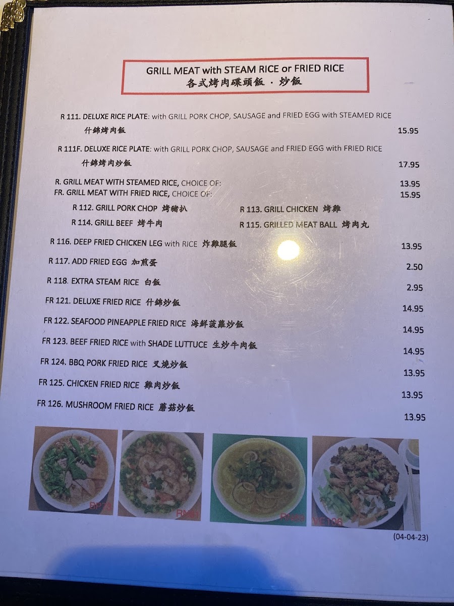 ................................CA$17.00R 111F. DELUXE RICE PLATE: with GRILL PORK CHOP, SAUSAGE and FRIED EGG with FRIED RICE